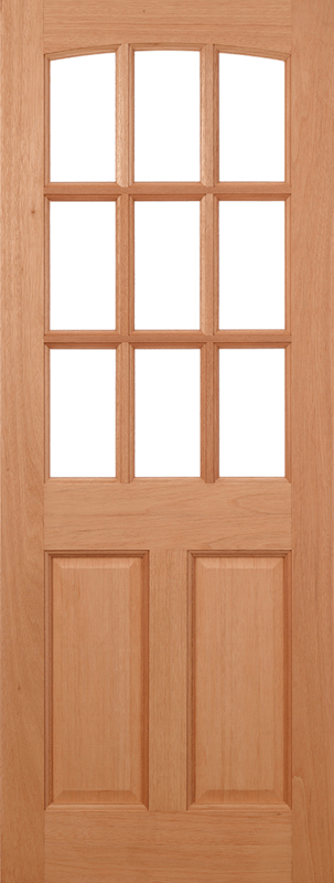 This Georgia door design features nine unglazed panels feature a subtle curved top edge, with two raised shaped panels in hardwood below.