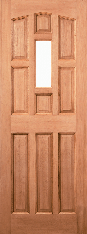 This classic York door design is crafted from hardwood and features various raised shaped panels with an unglazed panel.