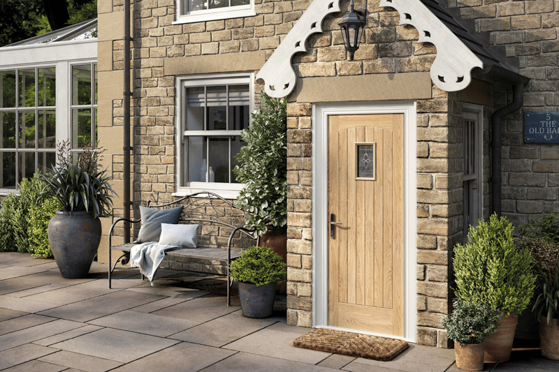 Perfect for your cottage property, this door design features a lead double glazed panel with light wood inlays and raised moulding on one side.