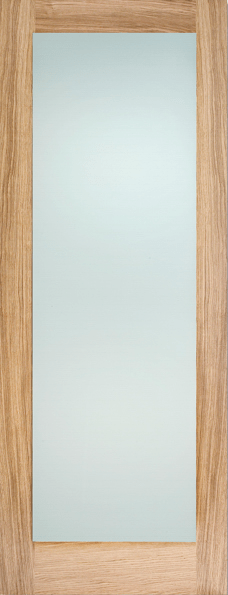 The Pattern 10 door design is crafted from unfinished Oak with a large centre panel in frosted glass.