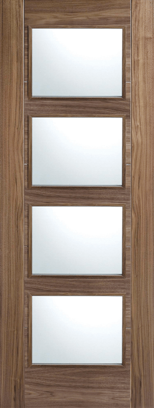 Four clear glazed panels sit in a pre-finished Walnut frame with raised moulding on both sides of this Vancouver Glazed door.