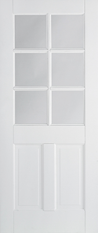 This classic Canterbury door design features six square clear glazed panels above two raised shaped panels in a white finish.