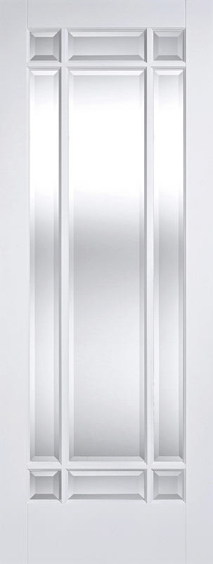 The practical Manhattan door design features clear bevelled glazed panels with decorative bars and is finished in a white shade.