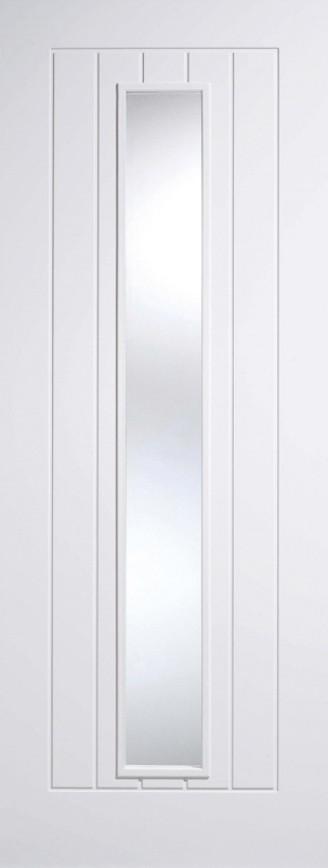 A large rectangular clear glazed panel is centred within grooved panels for this Mexicano door design, crafted from primed solid engineered core in white.