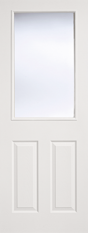 A clear glazed panel makes this door design a practical choice, with two raised shaped panels and raised moulding on both sides.